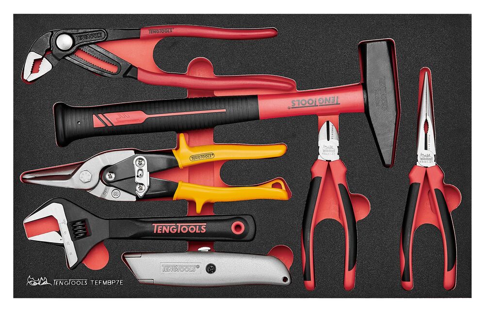 - Includes pliers, adjustable wrench, knife, tin snips and an engineer’s hammer