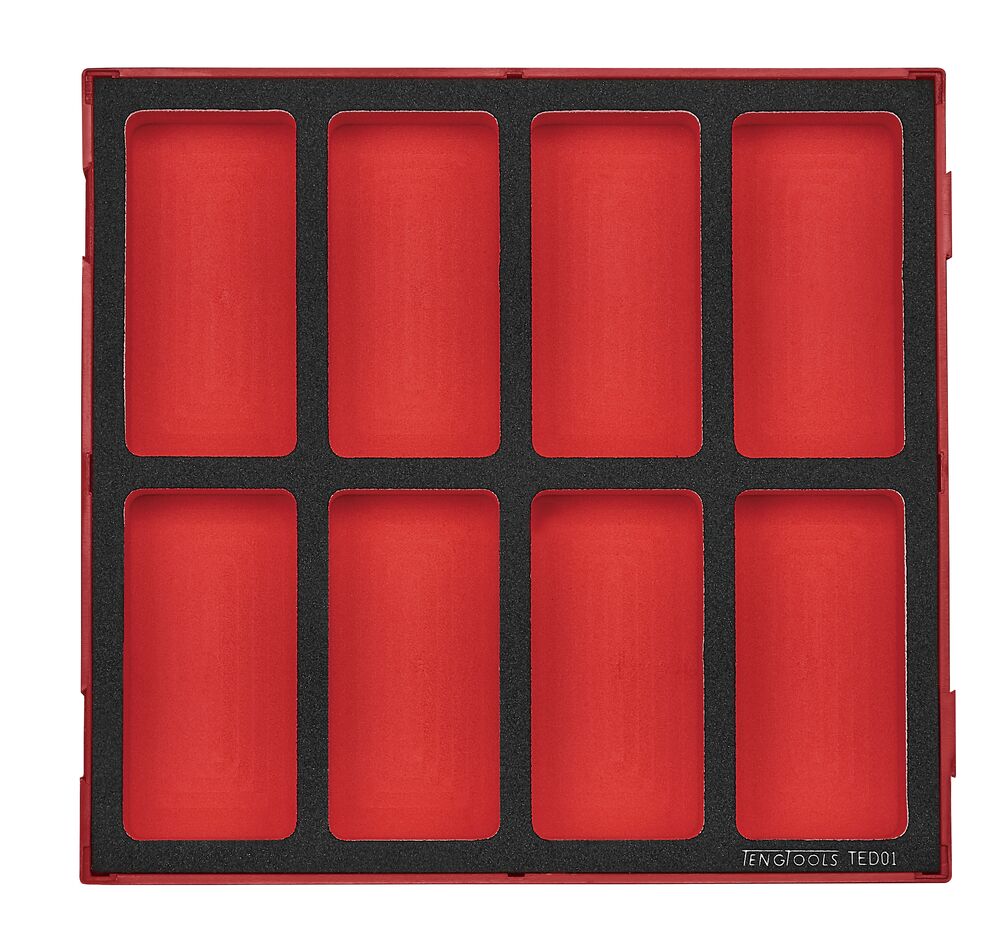 Storage tray made of three-colour pre-cut high- density EVA foam for storing small items in tool kits and workstations. The high-quality foam reduces rattling noises while moving and stays soft and flexible even in cold environments.