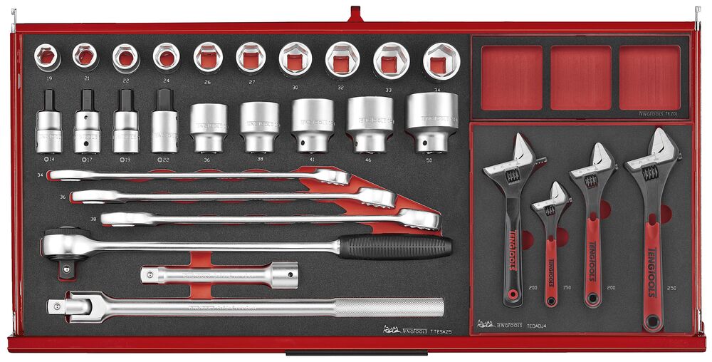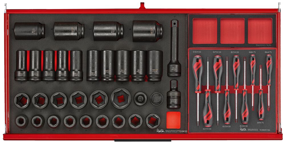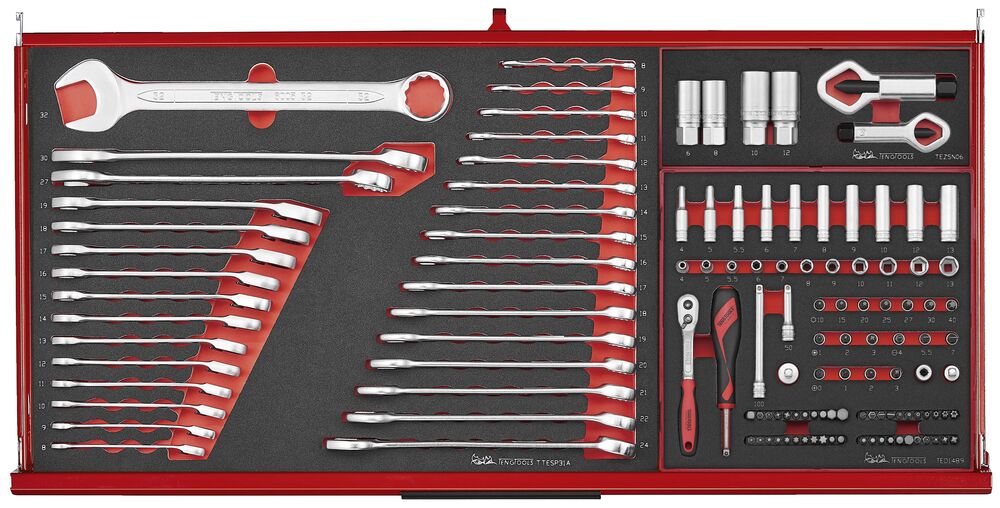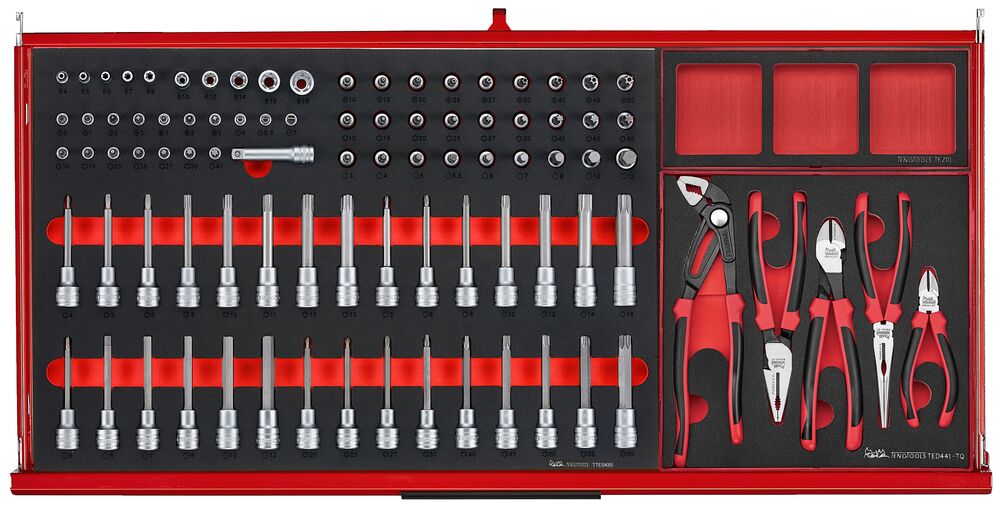 The TengTools 37" PRO35™ tool kit TKW37R513F in matte red is a robust 513-piece tool set designed for mechanics in the automotive industry and other demanding mechanical fields. The chassis of the roller cabinet features a 3-piece construction made of heavy-duty steel and has undergone a 5-step phosphate-free rust protection process for enhanced longevity and corrosion resistance. The overall dimensions of the roller cabinet are 964 mm in width, 460 mm in depth, and 985 mm in height with the castors mounted, providing ample storage space for a variety of tools while maintaining a manageable size that does not take up too much space in the workarea. It has two 2" wide heavy-duty castors, two 5" braked swivel castors, and two 5" fixed castors. A comfort grip handle on the side makes it easy to move, and the sides feature holes for accessories that can be used to customize the tool storage to specific needs. The roller cabinet has seven fully extendable drawers, five of which are 75 mm high and two larger drawers that are 154 mm high for bulky tools. The five smaller drawers have a load capacity of up to 25 kg each, while the larger drawers have a load capacity of up to 40 kg. The drawers are equipped with smooth-running ball-bearing slides and noise-reducing EVA mats. A user-friendly 3-digit combination lock secures all drawers simultaneously, eliminating the issue of handling keys that can be lost or copied. The tools include a wide selection of hand tools designed for heavy vehicle maintenance such as various drive sockets, bit sockets, ratchets, impact tools, combination spanners, screwdrivers, hex keys, T-handle TX keys, pliers, power grip pliers, and chisels. Each individual tool set is systematically organized in precision cut tri-colour EVA foam modules for easy identification of missing or misplaced tools. The tool kit includes a 5 mm thick EVA mat intended for the tool cart's work surface, five TEZ01 EVA modules with three compartments each for organizing smaller items, and a practical paper roll holder.