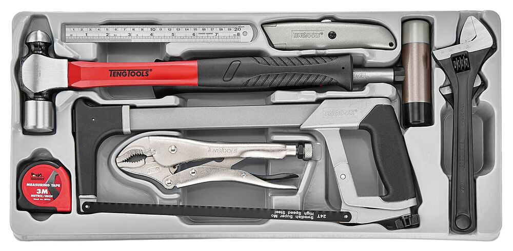 - Includes measuring, striking and cutting tools as well as an adjustable wrench and power grip pliers