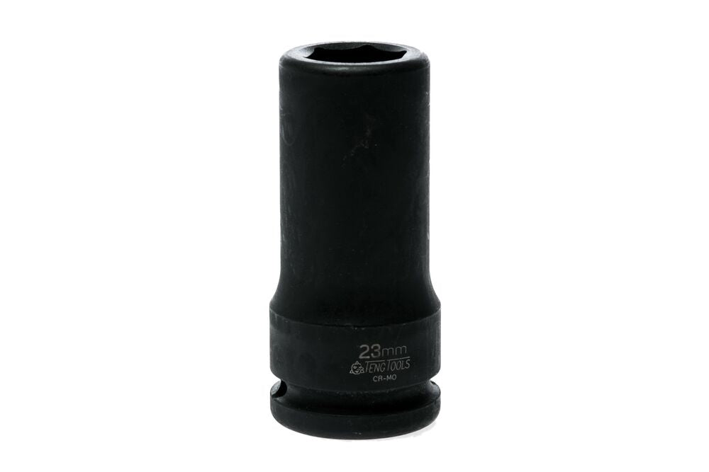 The TengTools 940623-C 3/4″ deep impact socket 23 mm is designed for daily professional use in assembly and disassembly tasks within manufacturing and maintenance. It is made from durable chrome molybdenum steel with a hardness of 40–48 HRC and features an anti-corrosive black phosphated surface. The socket conforms to the DIN standard and includes a 3/4″ square drive with a groove for a retaining ring and a through hole for a retaining pin, intended for attachment to power tools. The hexagonal profile incorporates TengTools 'Hip Grip' which grips the flat sides of the fastener, reducing the risk of deformation or slippage when force is applied.