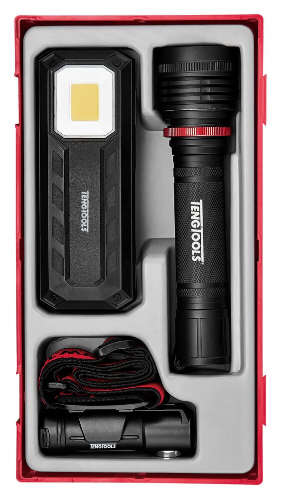 TengTools TTLA03 3-delers LED-lyssett inkluderer en oppladbar LED-lommelykt, en oppladbar LED-arbeidslampe og en oppladbar multifunksjonell LED-hodelykt. Settet er av profesjonell kvalitet med IP-klassifiserte konstruksjoner og justerbare lysmoduser for å lyse opp under kjøretøy, trange industrilokaler eller nattlige utendørsprosjekter. TengTools 584N oppladbar LED-lommelykt har et hus i svart aluminiumlegering med lav vekt, fire lysmoduser og 2,5–8 timers driftstid. TengTools 588N oppladbar arbeidslampe med doble lyskilder har en justerbar krok og en sterk magnet for montering. TengTools oppladbar hodelykt har en 400 lm Cree LED med opptil 3–16 timers driftstid samt et justerbart hodebånd med lampefeste som kan vinkles opptil 60°. Alle lampene i settet er utstyrt med magneter for håndfri bruk. Alle lampene er utstyrt med praktisk USB-C-lading og en USB-C-ladekabel er inkludert i settet. Innholdet er organisert i en verktøymodul størrelse 1 (TT1), kompatibel med TengTools Tool Control System.