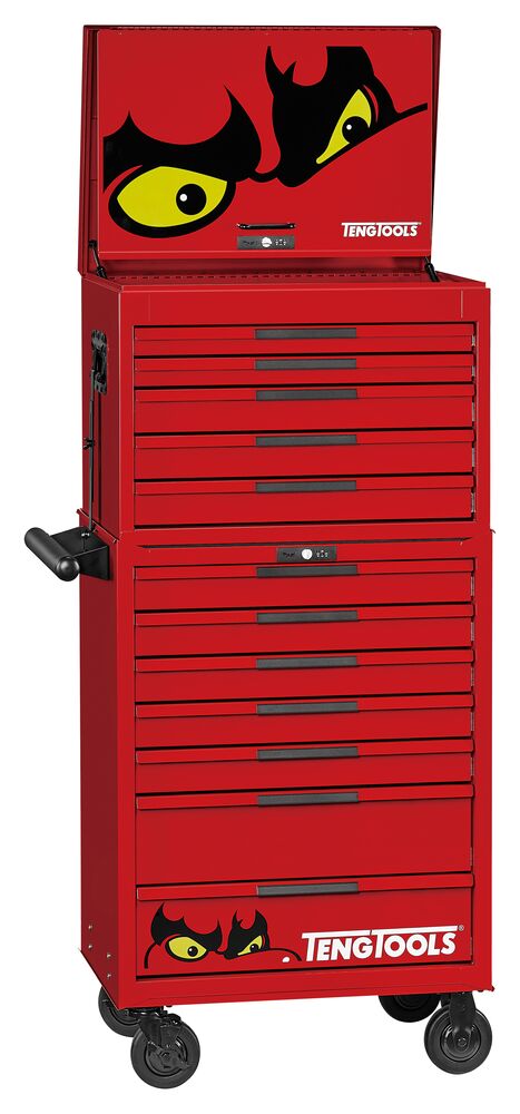 - 12-drawer stacked tool storage with full extension ball bearing slides and a 30 kg capacity per drawer