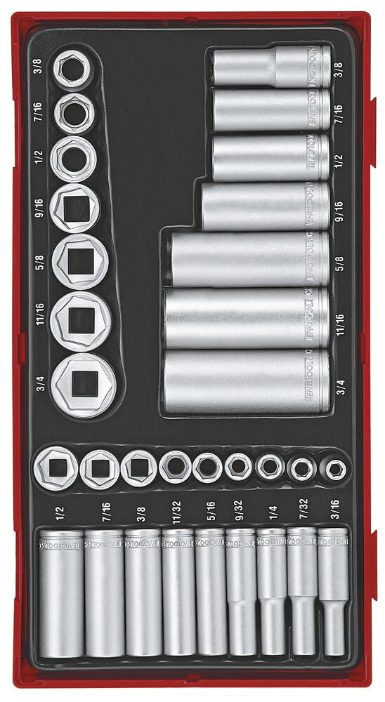 32-elementowy zestaw nasadek calowych z chwytem kwadratowym 1/4" i 3/8" Teng Tools TTAF32
