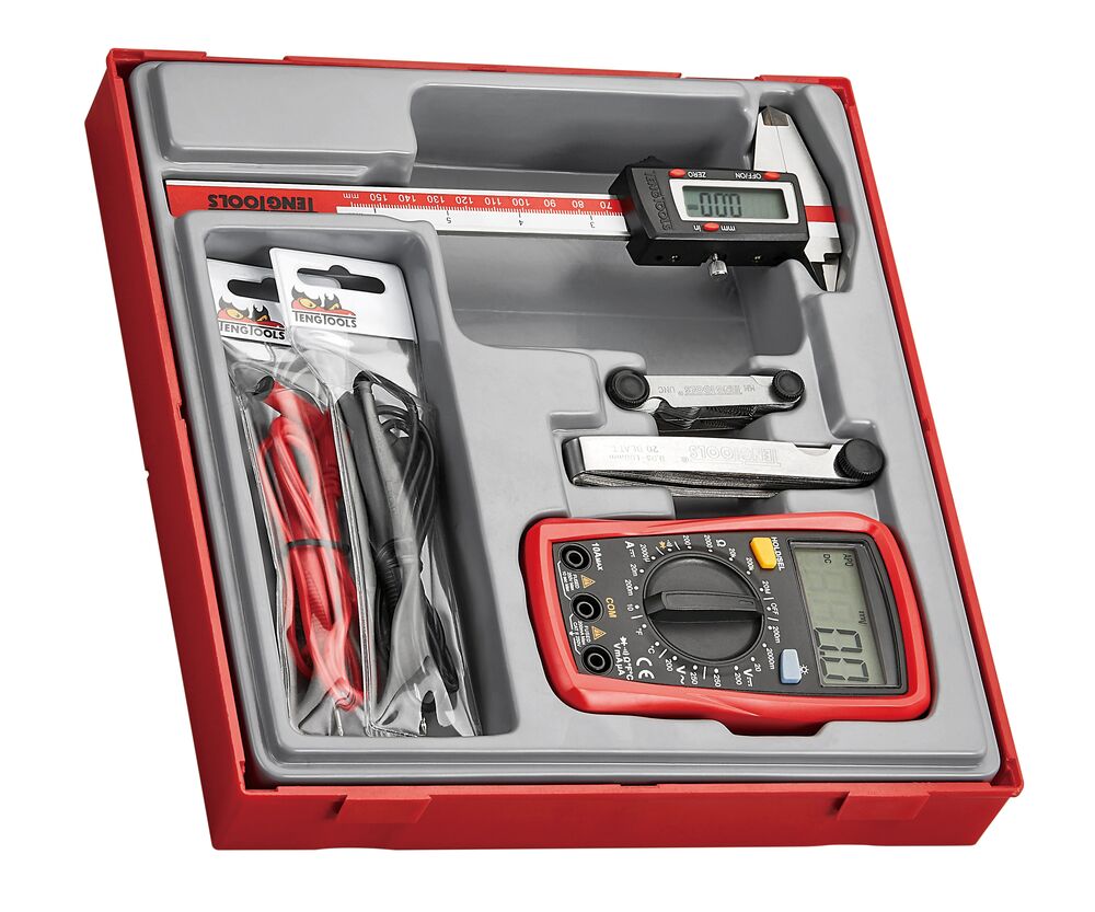 - Sats med digitalt skjutmått, multimeter, gängstigningsmätare och bladmått
